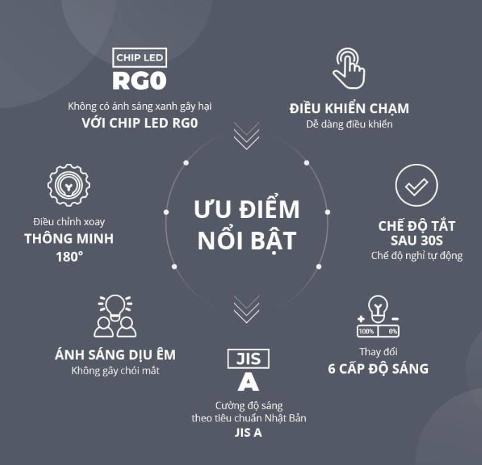 Chế độ tắt sau 30 giây. Trục đèn gập/ xoay thông minh.