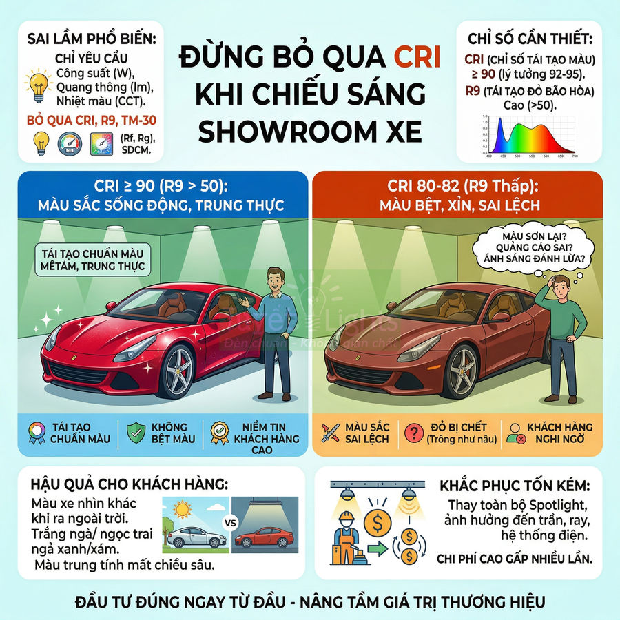 Một trong những sai lầm mang tính “chí mạng” trong thiết kế chiếu sáng showroom xe là ưu tiên giá rẻ, bỏ qua CRI và các chỉ số màu nâng cao. Nhiều chủ đầu tư chỉ yêu cầu “đèn LED 20–30W, 4000–5000K, đủ sáng” mà không hề đề cập đến CRI (Color Rendering Index) hay R9, R12… dẫn đến việc nhà thầu tự do chọn loại đèn phổ thông, CRI chỉ 80–82, vốn chỉ phù hợp cho văn phòng, hành lang, bãi đỗ xe.